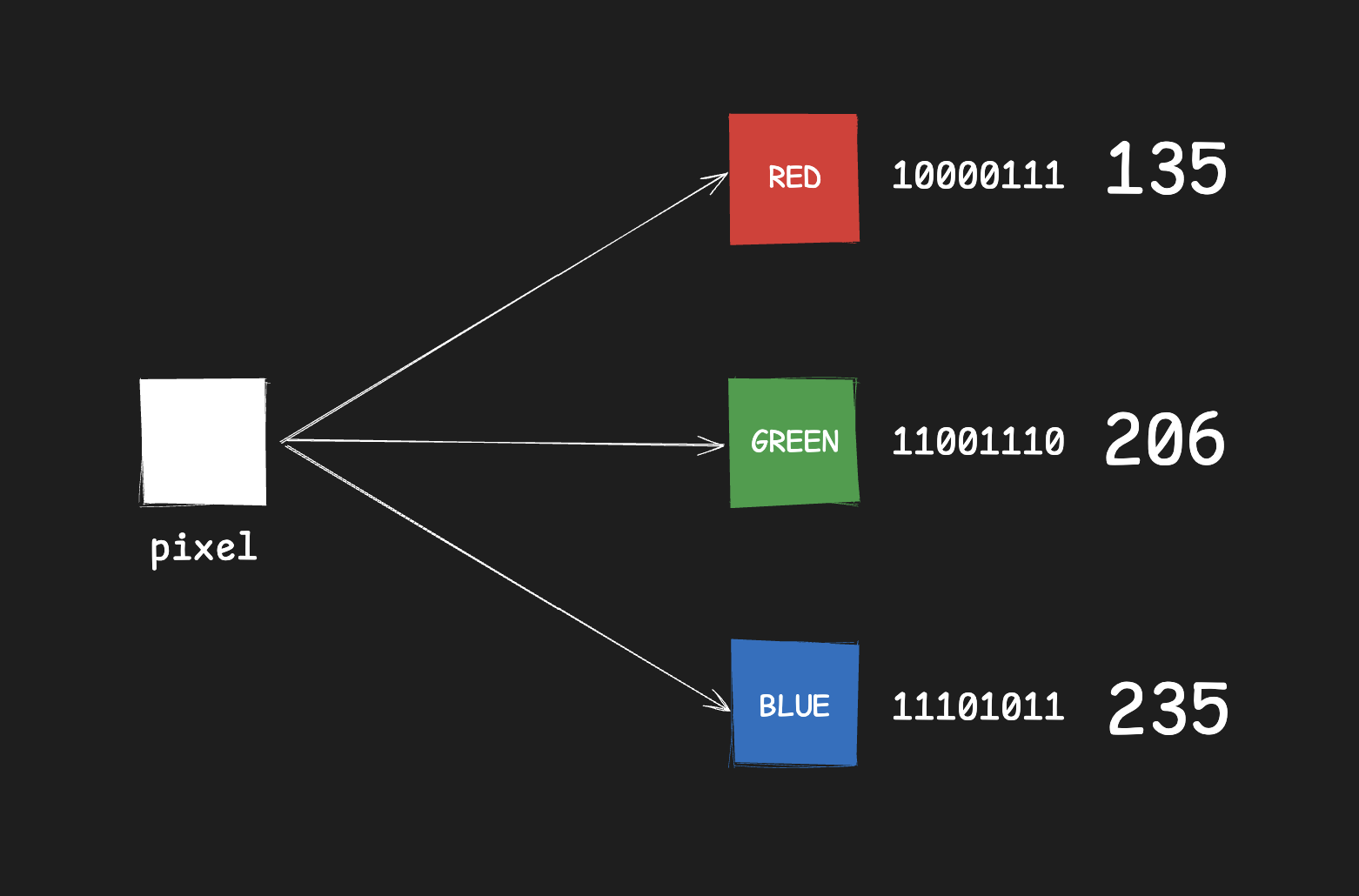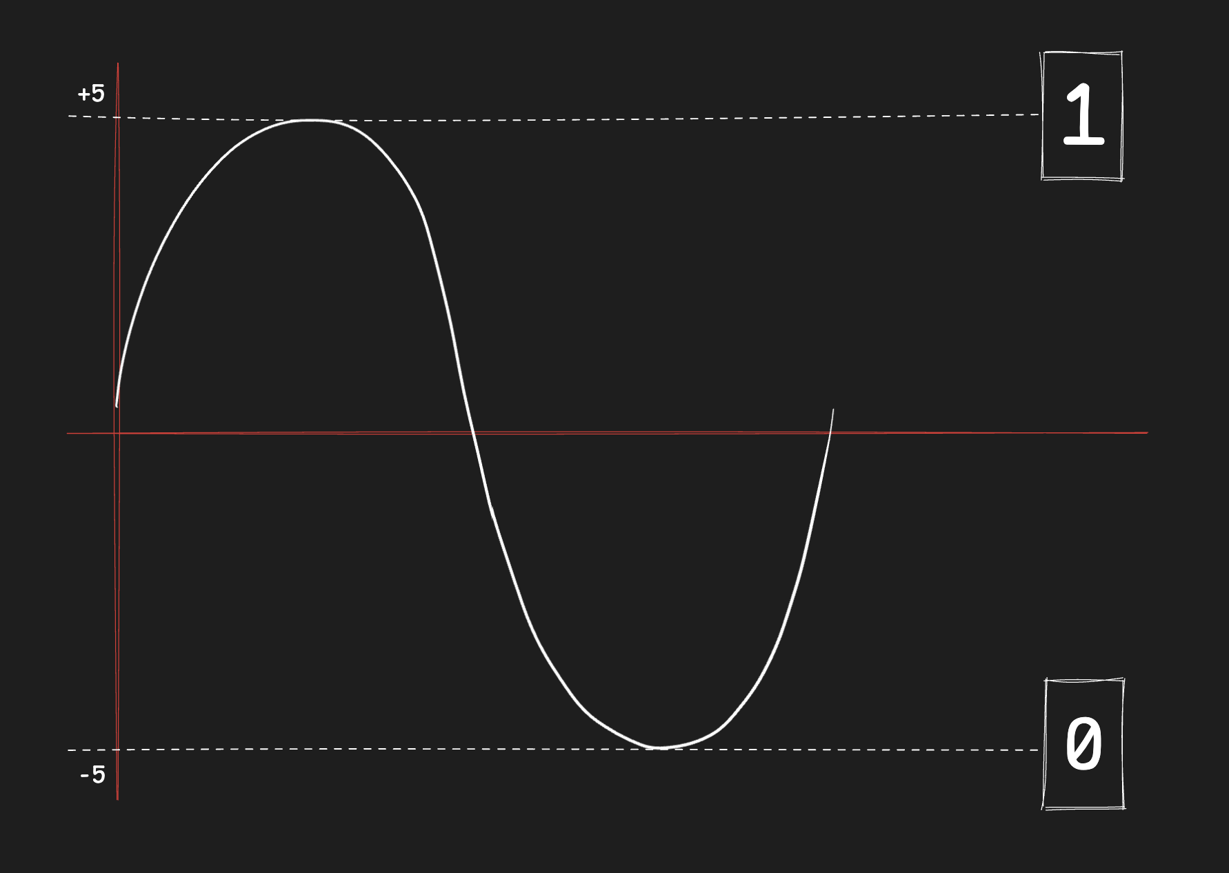 This format of numbering is not usually read by humans and is often represented in other forms like a letter from an ASCII table, a pixel on the screen, or converted into hexadecimal. In computers, these signals are passed by transistors, through which it is much simpler to represent two values: a high voltage and a low voltage.