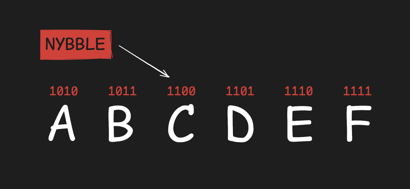 Nybble: A group of 4 bits. One nybble maps exactly to one hexadecimal digit. ↩︎